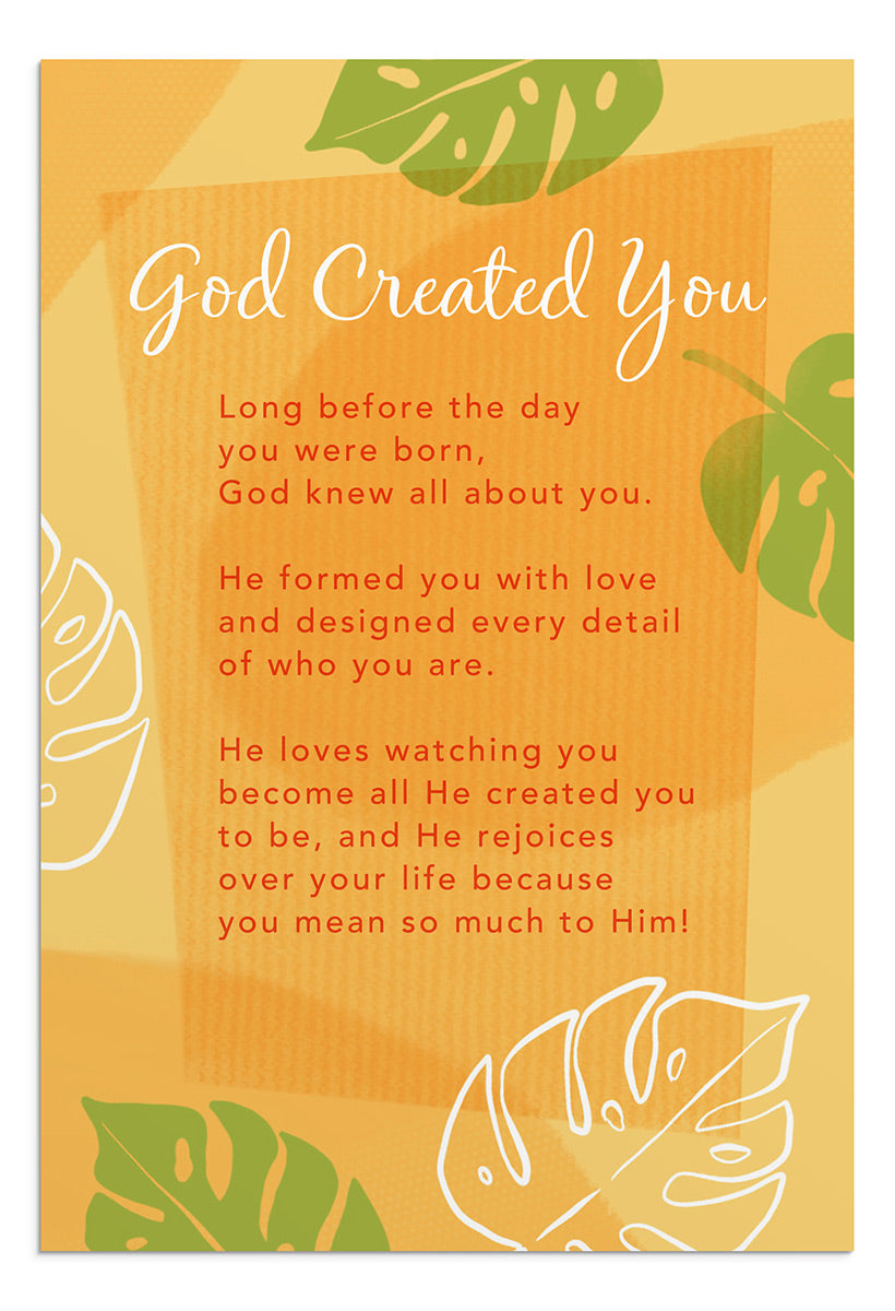 Front: God Created You Long before the day you were born, God knew all about you. He formed you with love and designed every detail of who you are. He loves watching you become all He created you to be, and He rejoices over your life because you mean so much to Him!