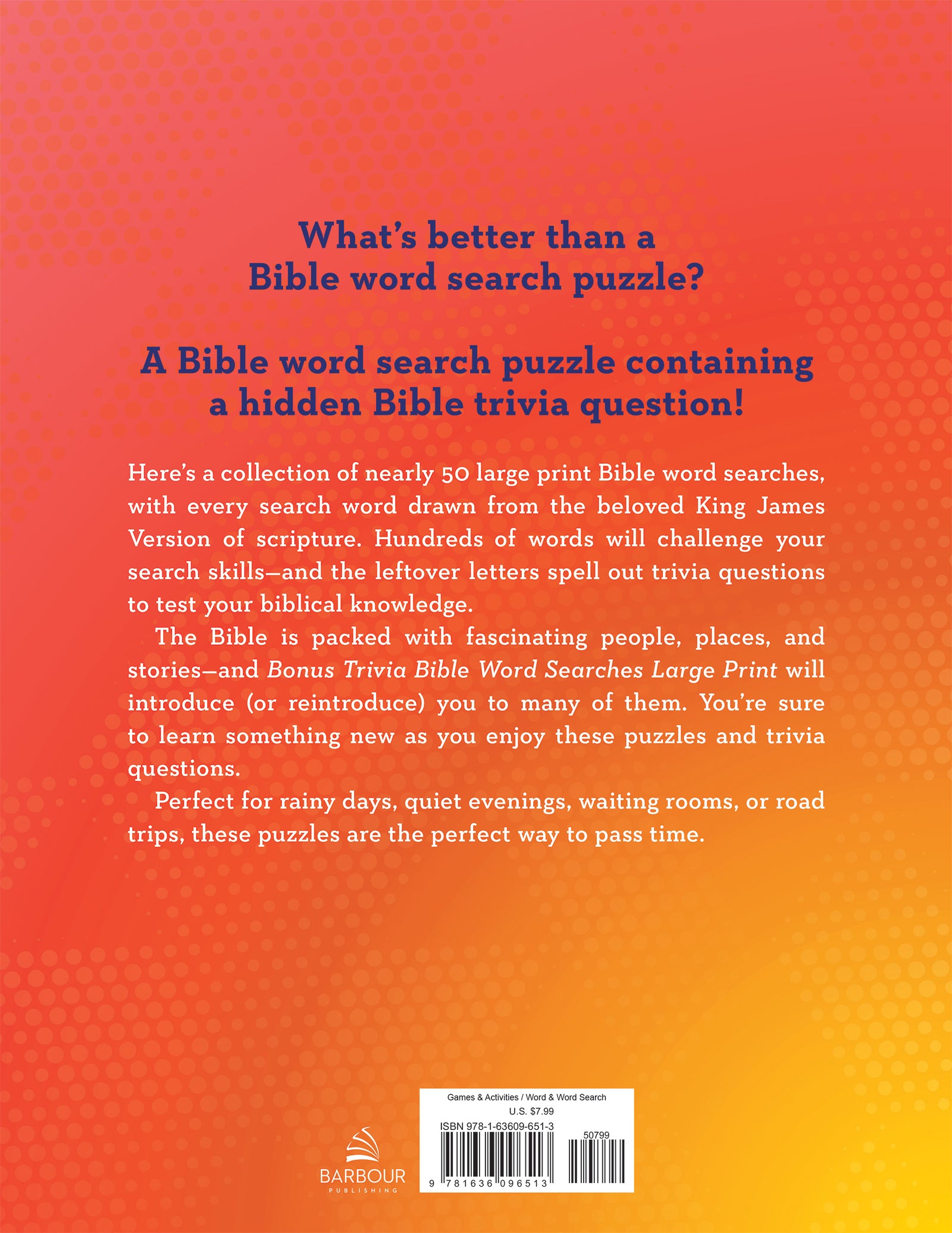 Perfect for rainy days, quiet evenings, waiting rooms, or road trips, Bonus Trivia Bible Word Searches Large Print is the perfect way to pass time.