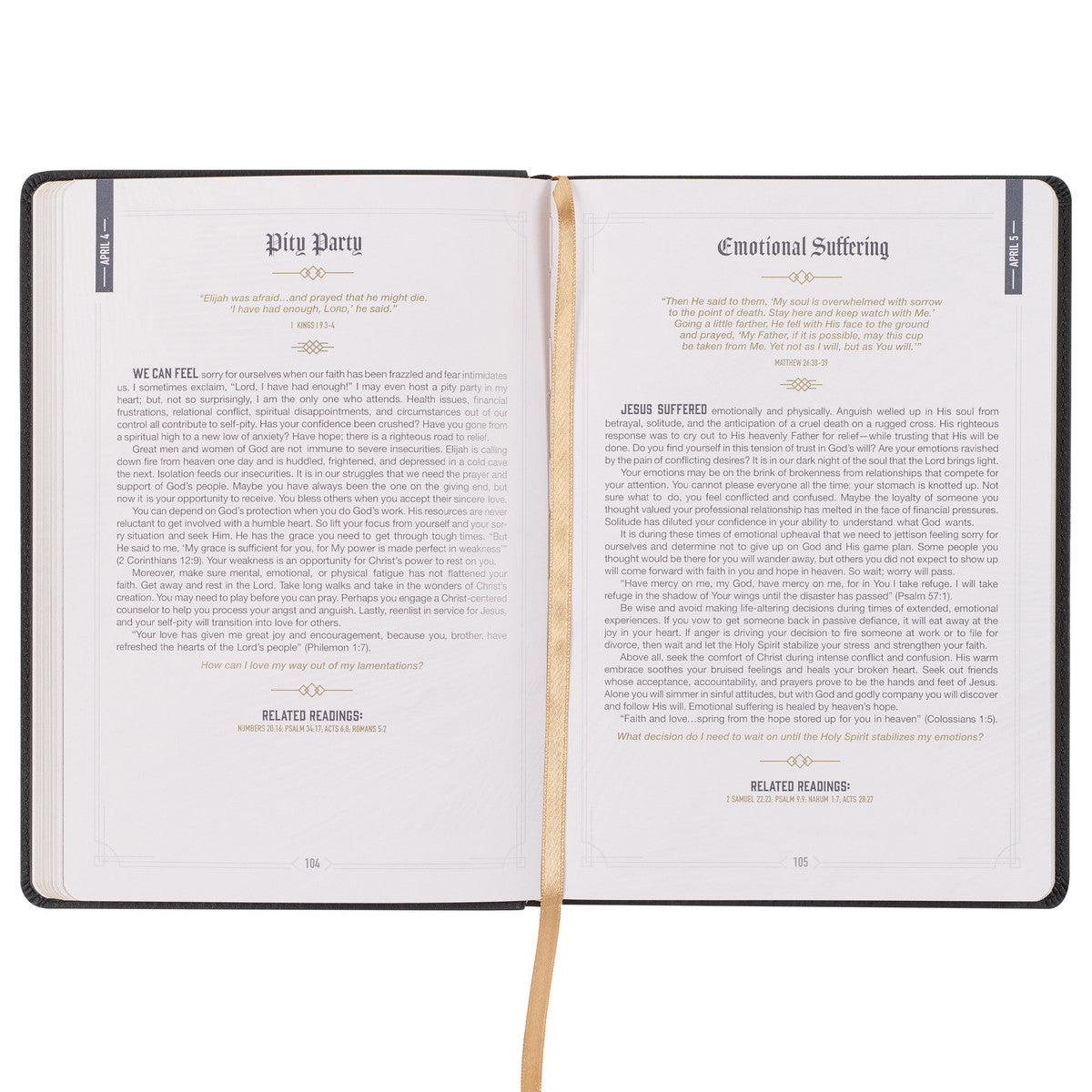 The black faux leather cover of the daily devotional for men features subtle heat-debossed accents and has a simple gold-foiled border that frames the gold-foiled title.