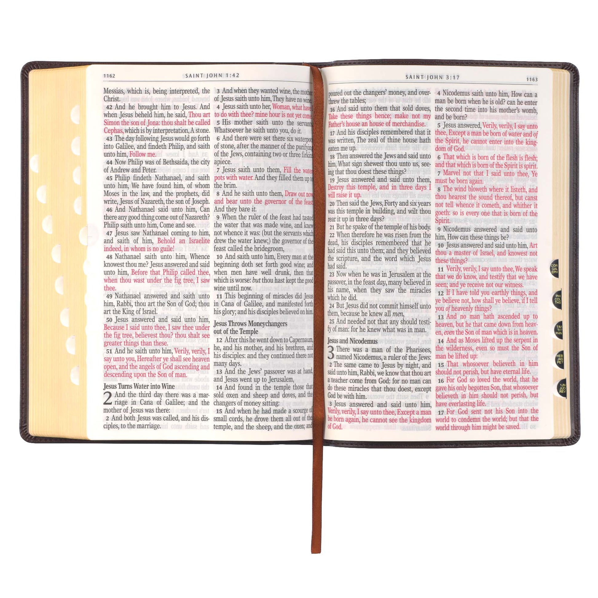 The understated elegance of the Espresso Brown Faux Leather Giant Print Full-size King James Version Bible with Thumb Index is the picture of timeless grace that will always be in season. The same goes for the easy-to-read 14-point type print of the Classic King James Version Bible.