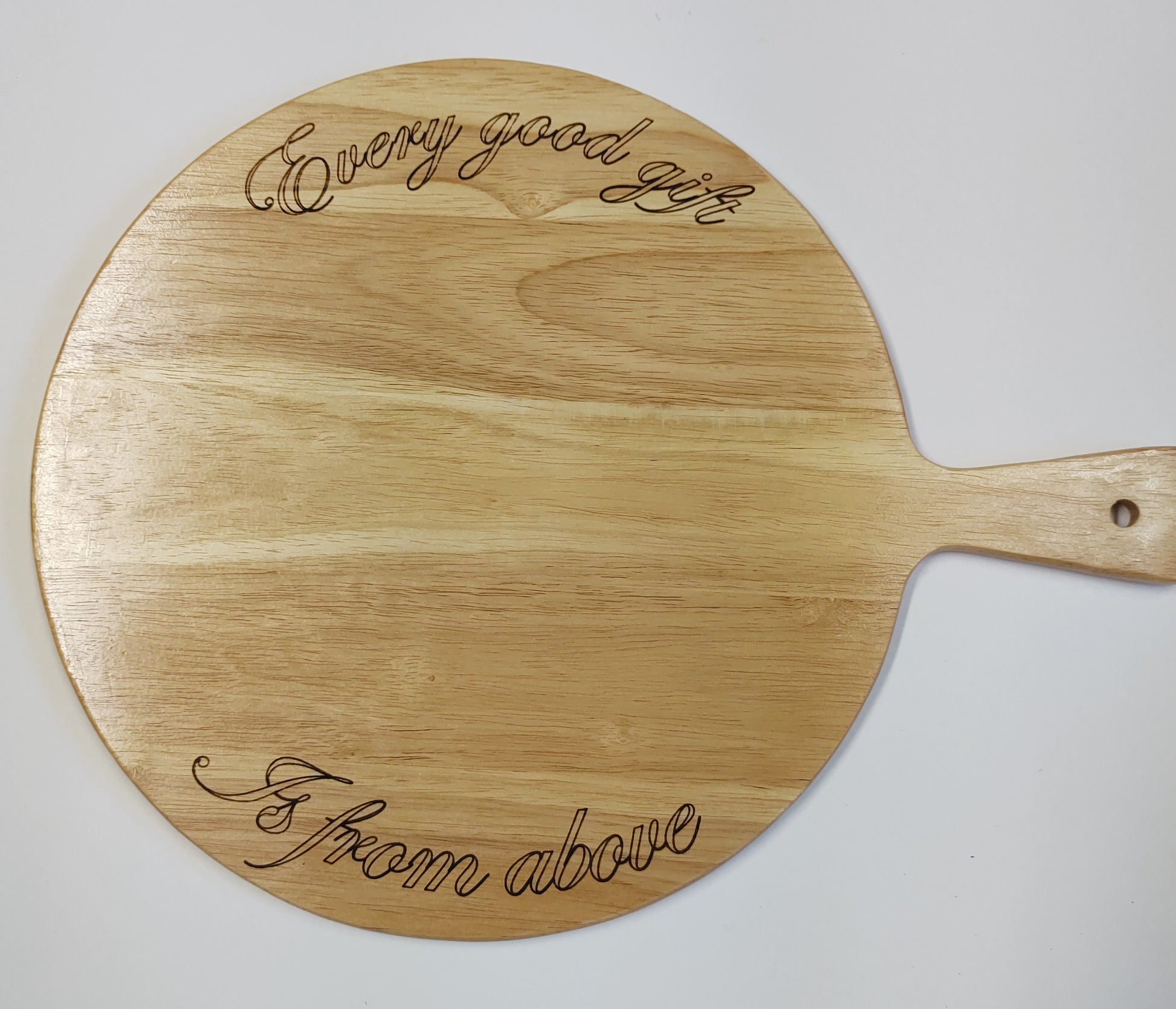 A practical and stylish gift for every pizza lover! Serve your pizza and show your faith to friends and family. The pizza board is approximately 34cm in diameter and has the wording 'Every good gift is from above' on it.