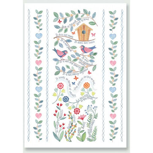 Hannah Dunnett Love Is Patient Card - A delightful A5 card which includes the words from 1 Corinthians 13:4-7 formed around the image of 2 birds, a tree house, leaves and flowers. The words read -