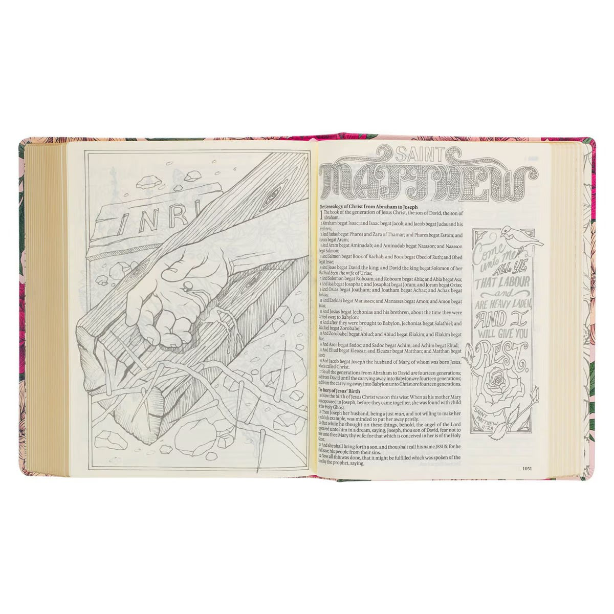 The hardcover Bible is wrapped in rose-pink faux leather, screen-printed with a gorgeous floral design. The title is accented with gold-foiled flourishes. The version reference is elegantly positioned below the title, adorned with gold-foiled letters and beautifully framed in gold foil.