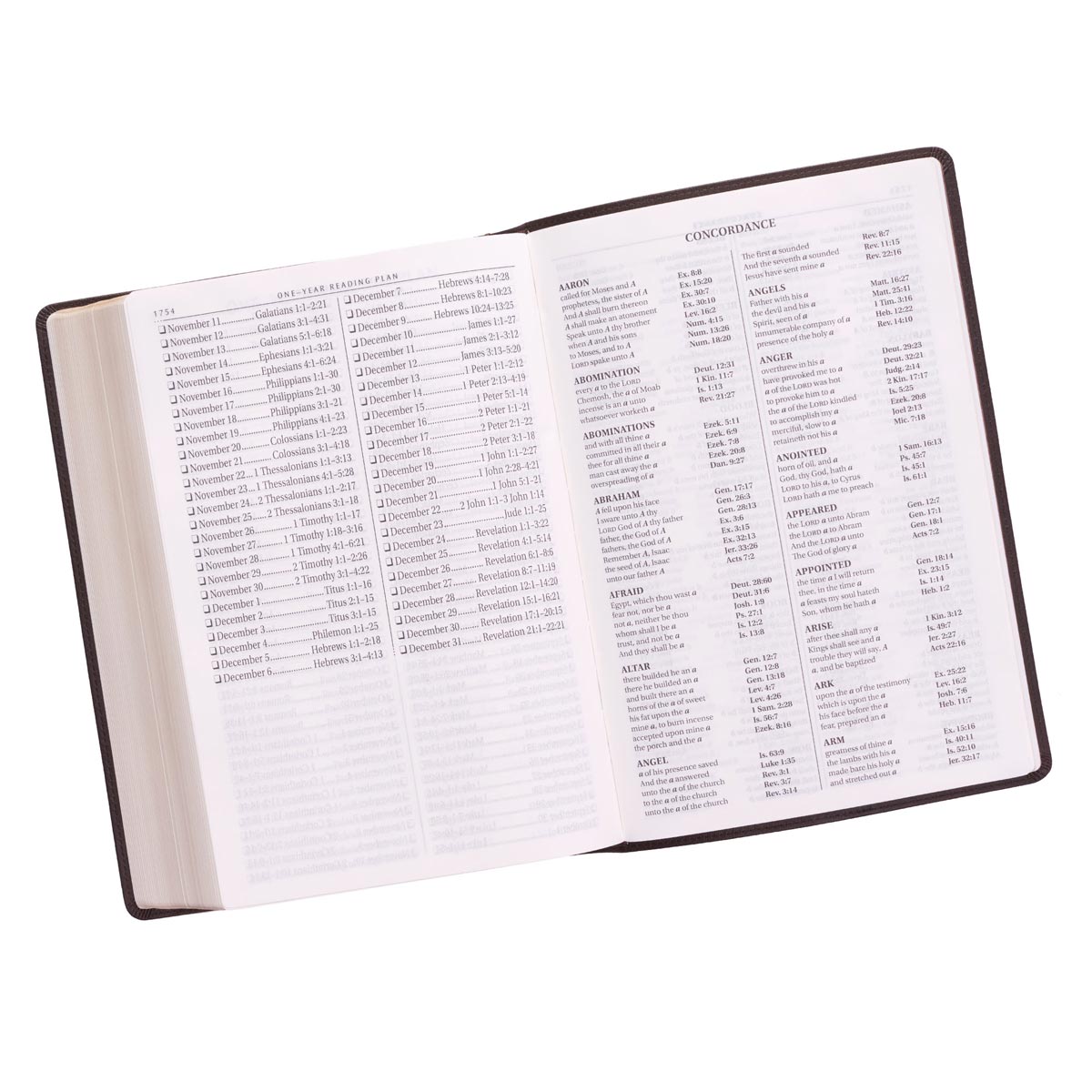Topstitching around the edges of the Bible lends durability and strength to the design. With an easy-to-read 17-point type in a double-column format and footnote cross-reference guide, concordance, and thematic Scripture verse finder, you'll find this Bible an excellent tool for study and readable without strain. The words of Christ are printed in red ink, and there are eight full-colour annotated biblical maps.