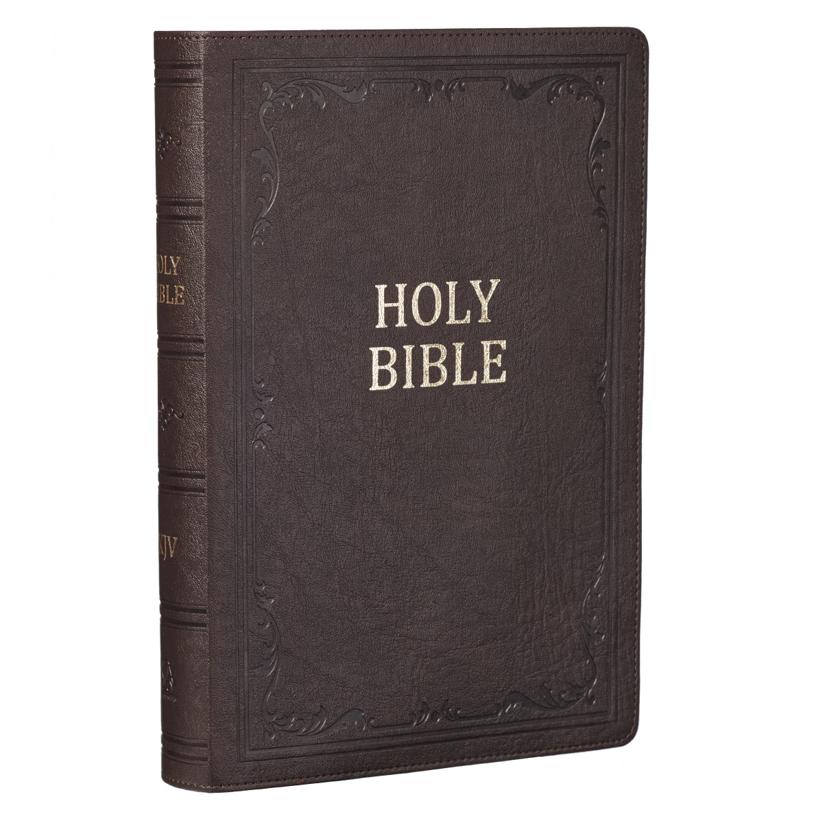 The dark brown faux leather cover of the super giant print Bible features a simple heat-debossed frame accented with a flowing leaf design. The title is gold-foiled on the front cover.