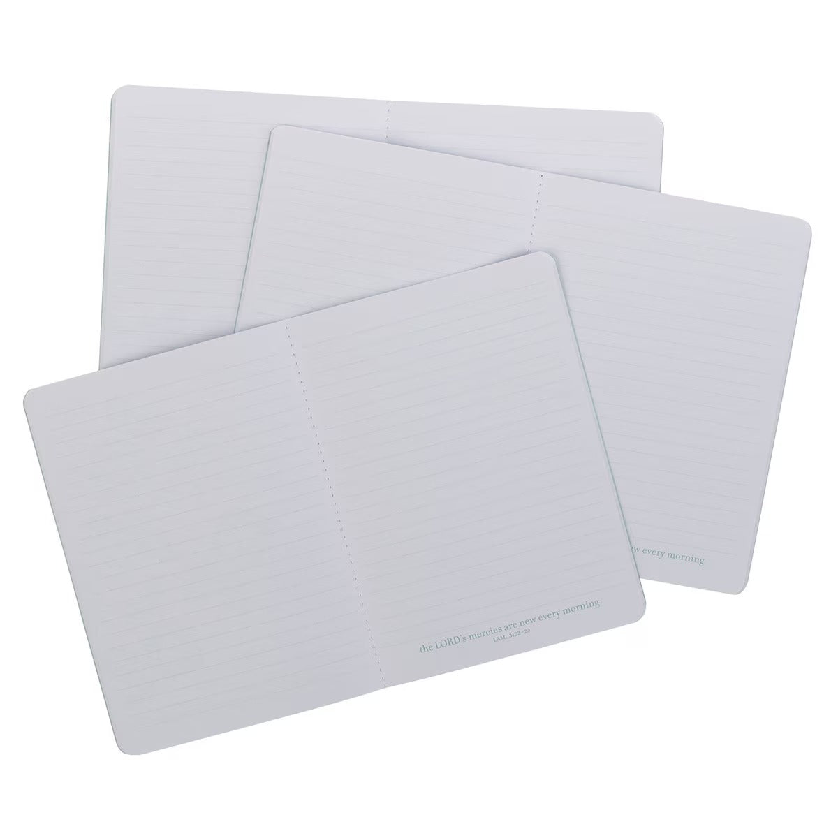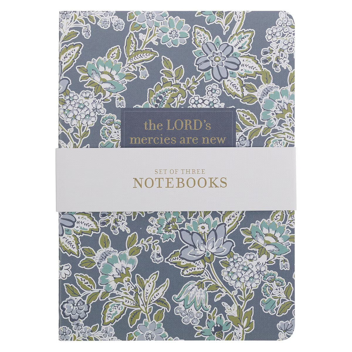 - The first notebook in the set features a navy blue background wrapped in a vibrant design of teal, green, and white blossoms. The gold-foiled sentiment is displayed on the front cover inside a framed navy blue box: The Lord's mercies are new every morning - Lamentations 3:22–23.