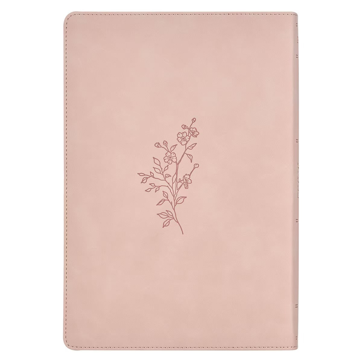 The soft, pale pink faux leather cover is heat-debossed with a delicate floral design that wraps the woman's Bible in timeless beauty. Gold-foiled details are added to the centres of the flowers. A gold-foiled frame in the centre displays the gold-foiled tile and translation name. The floral detail continues on the spine and the back cover. The title and translation name are also framed on the spine.