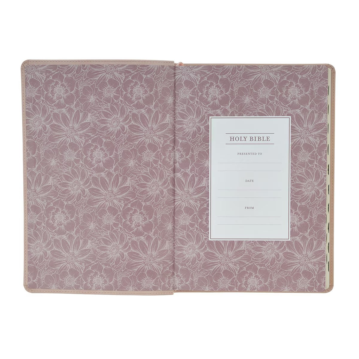 Beautifully designed in soft pink tones, the Pale Pink Floral Faux Leather King James Version Deluxe Gift Bible with Thumb Index offers a charming and timeless way to stay rooted in God's Word.