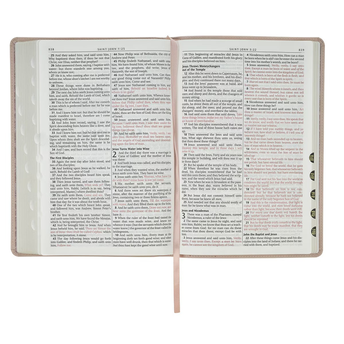 Topstitching along the edges ensures lasting durability. Thumb indexing lets you flip easily between books, and the pink satin ribbon marker helps you keep your place. Gold gilt-edged pages catch the light with every turn and echo the timeless beauty of Scripture.