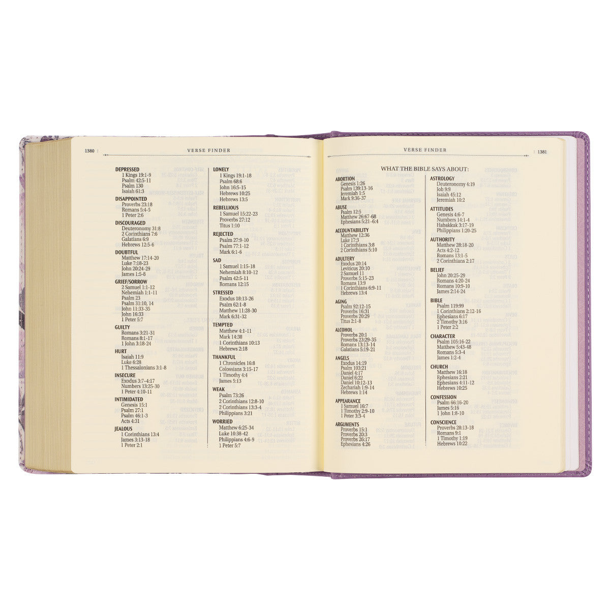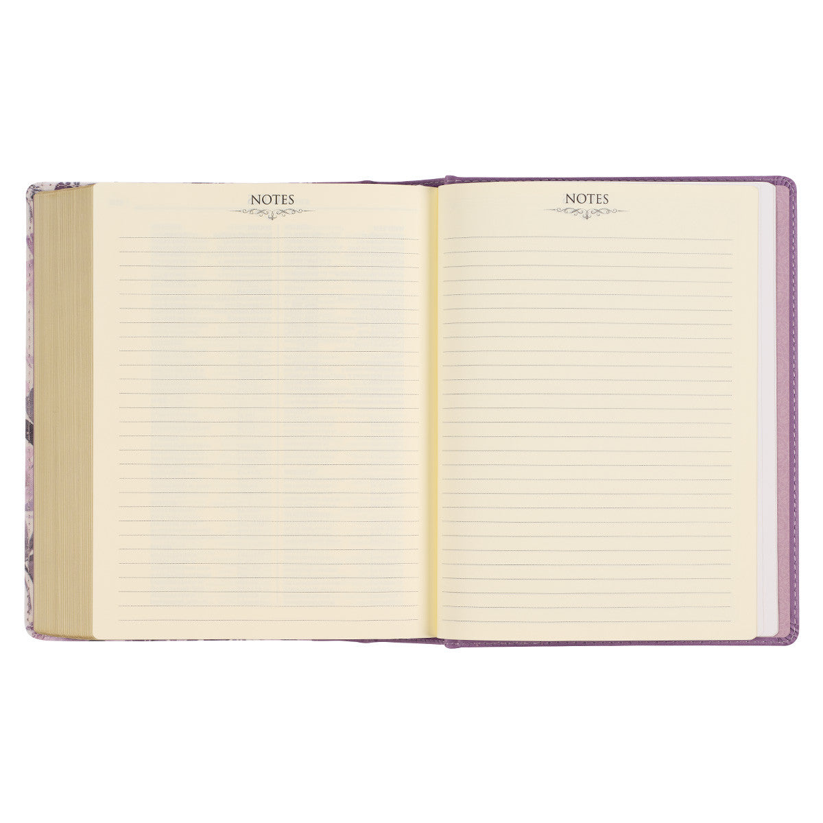When you use the Purple Floral Faux Leather Hardcover King James Version Note-taking Bible, you can say goodbye to the days of trying to find the perfect journal for your morning devotions. With plenty of lined space, you can keep all your notes and reflections in one place, written out right next to God's Word.