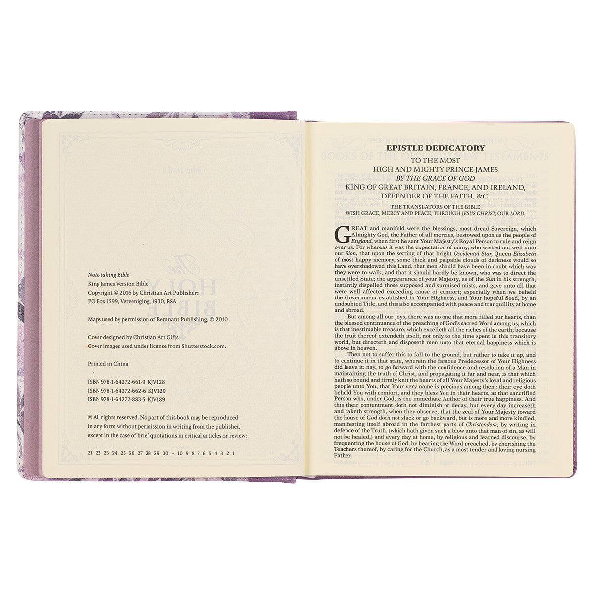 Undoubtedly, this Bible will be developed into a personalized map of your spiritual journey and will be cherished by girls and women of all ages. Whether it is a graduation gift, appreciation present, or part of a care package, the Purple Floral Faux Leather Hardcover King James Version Note-taking Bible will become part of a personal testimony.