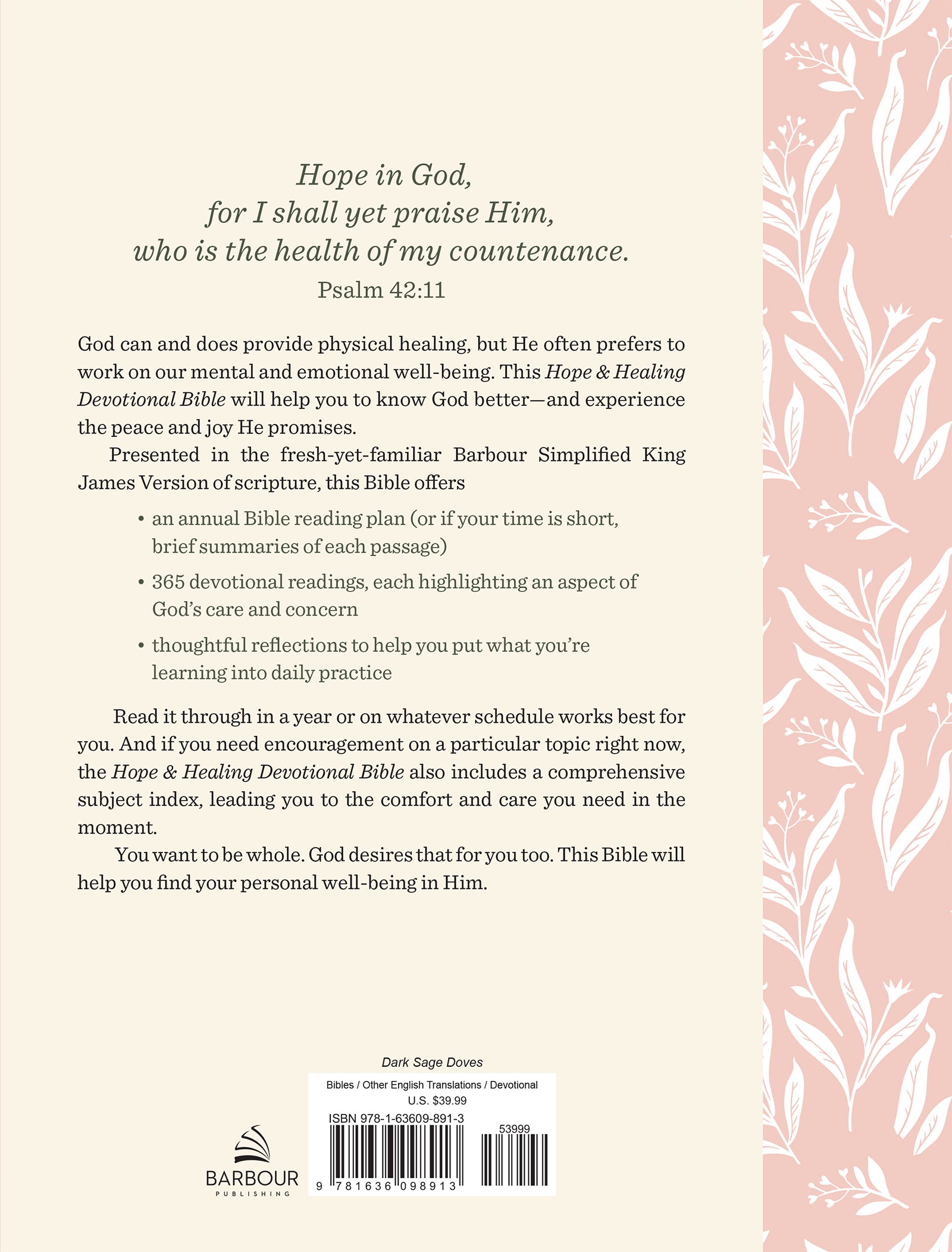 God can and does provide physical healing, but He often prefers to work on our mental and emotional well-being. This brand-new Hope & Healing Devotional Bible will help you to know God better—and experience the peace and joy He promises. Presented in the fresh-yet-familiar Barbour Simplified King James Version of scripture, this Bible offers