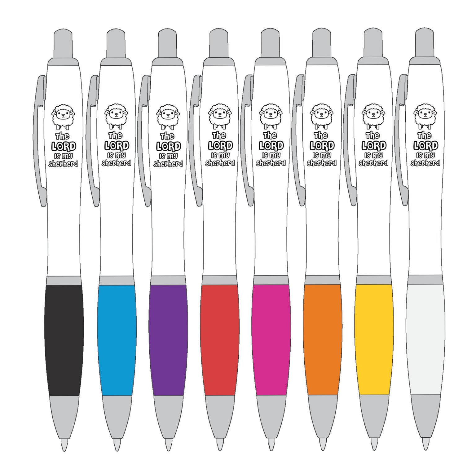 A delightful pen featuring an adorable lamb illustration paired with the comforting words "The Lord Is My Shepherd." Available in a cheerful range of colours, this charming writing companion brings a touch of faith and whimsy to your daily notes and correspondence.