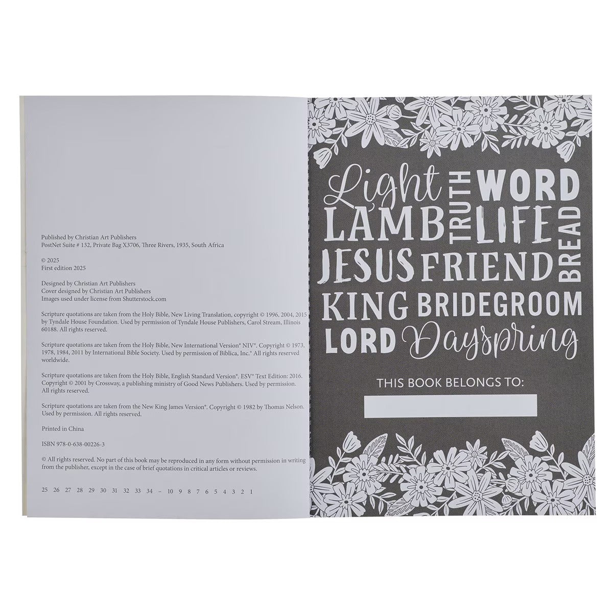 Colouring books make great gifts, and this one offers a presentation page that can be personalised with colour and a message. Interior pages alternate between traditional white and contemporary black backgrounds. There are 45 of Jesus' names, each accompanied by a specially selected Scripture verse. The full-page line-art illustrations are printed single-sided on perforated pages that are easy to remove. At the back of the book are bookmarks to colour and share.