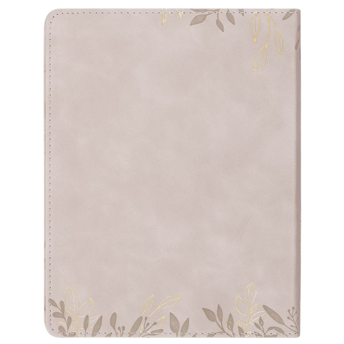 The taupe faux leather daily devotional has a beautiful exterior design. A gold ribbon marker brings out the gold-foiled foliage that lines the velvety cover. The title is framed in a gold-foiled square box and centred inside the foliage.