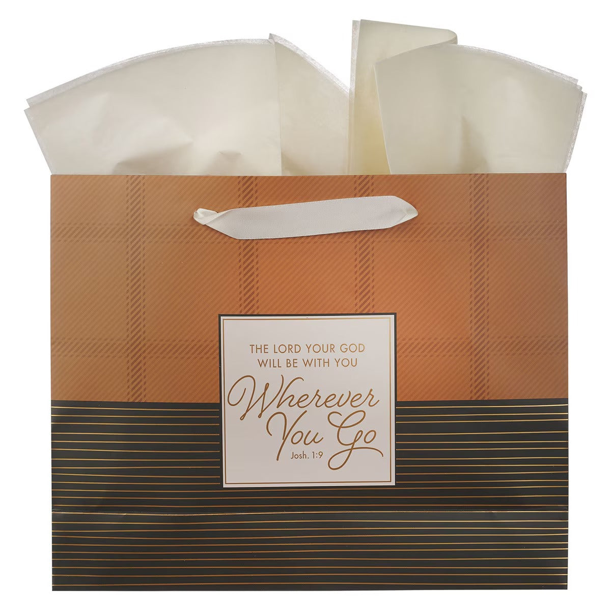 The large gift bag features a warm caramel-brown backdrop with a subtle plaid texture. A black band with gold pinstripes runs across the bottom, grounding the design. At the centre, the sentiment is displayed in a crisp white block with an elegant gold foil and black double frame, as well as warm gold foiled lettering: The Lord your God will be with you wherever you go - Joshua 1:9.