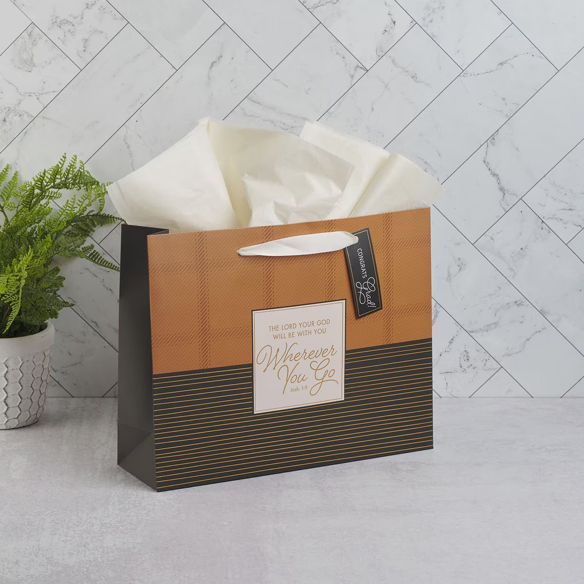 Celebrate graduation with a gift bag that delivers a promise straight from Scripture with the Wherever You Go Brown Striped Plaid Large Landscape Gift Bag. This sophisticated gift bag, with its encouraging sentiment, will make your graduation gift all the more memorable.